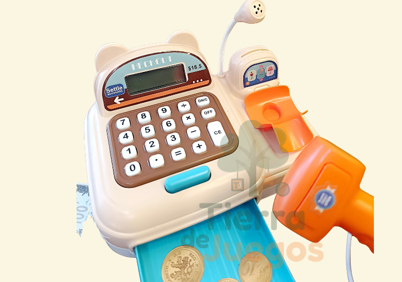 Esta registradora con detalles realistas y múltiples funciones (incluye calculadora) permite a los niños explorar roles, estimular la creatividad y fortalecer conceptos como números, turnos y comunicación.