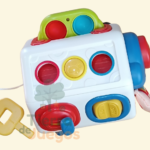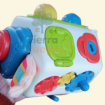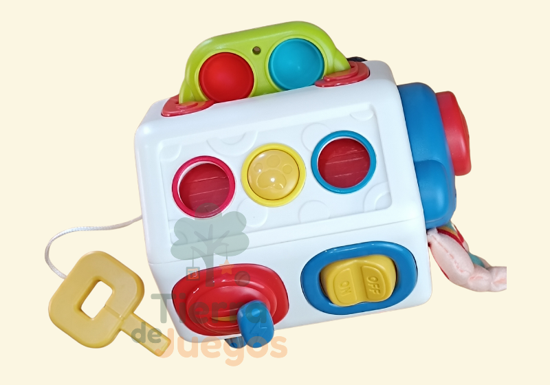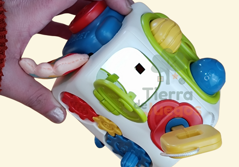 Con interruptores, engranajes, llaves y botones, y espejito este cubo de actividades invita a explorar, descubrir y desarrollar la coordinación mientras se juega.